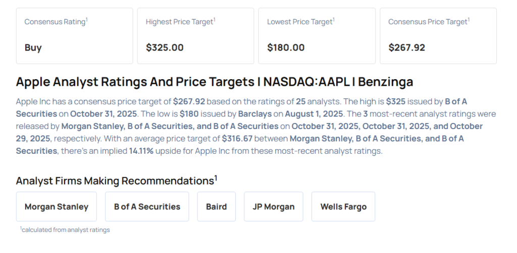 - B of A Securities increased Apple Inc. (NASDAQ:AAPL) price target from $320 to $325. B of A Securities analyst Wamsi Mohan maintained a Buy rating. Apple shares settled at $271.40 on Thursday. See how other analysts view this stock.