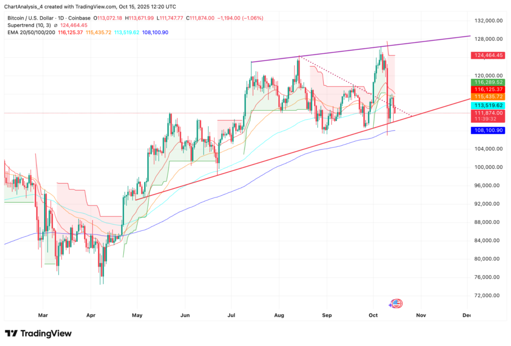 The token remains inside a broad rising channel, with $111,000–$112,000 serving as key support and the 200-day EMA near $108,100 acting as the final floor for the bullish structure.