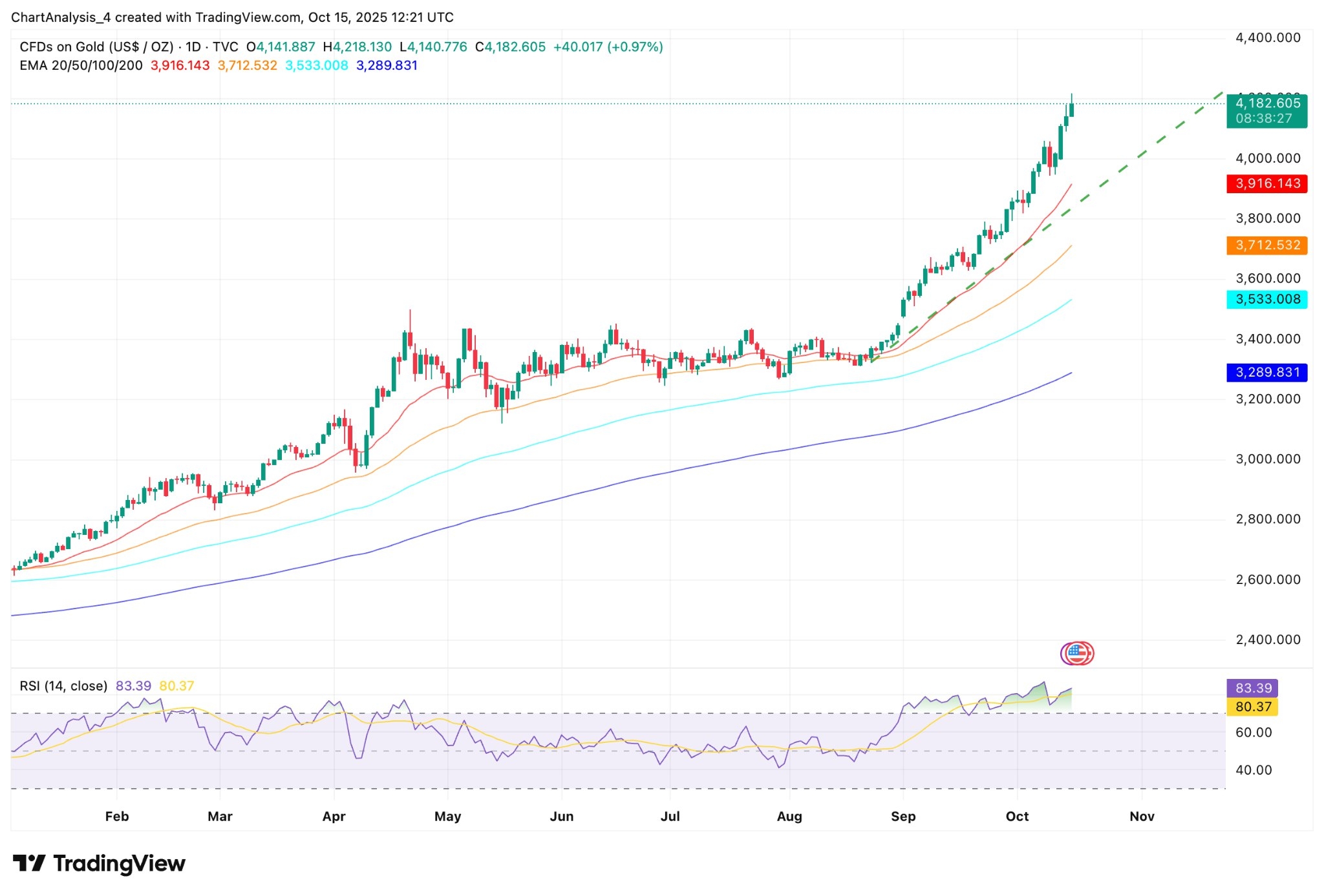 Technically, gold trades well above its 20-day EMA at $3,916, with the RSI near 83, indicating overbought conditions but strong momentum.