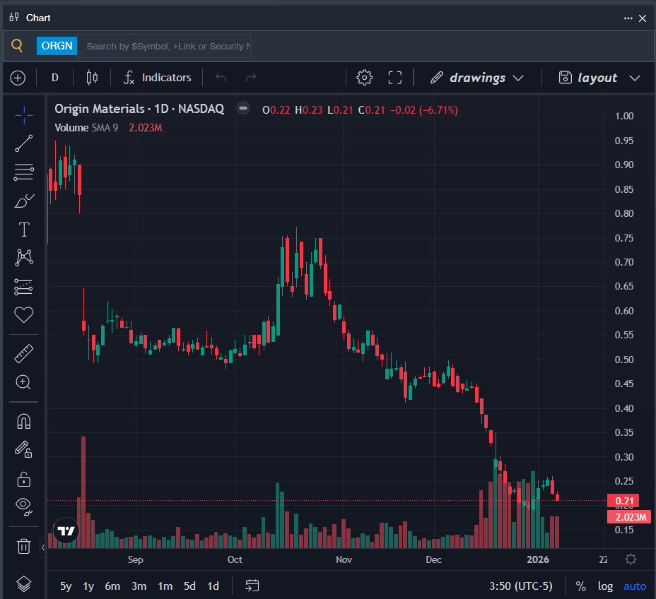 - ORGN Price Action: Shares of Origin Materials fell 6.7% to close at $0.21 on Thursday.