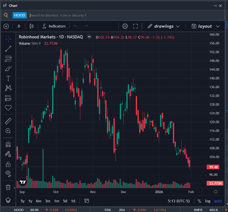 - HOOD Price Action: Shares of Robinhood fell 1.7% to close at $99.48 on Friday.