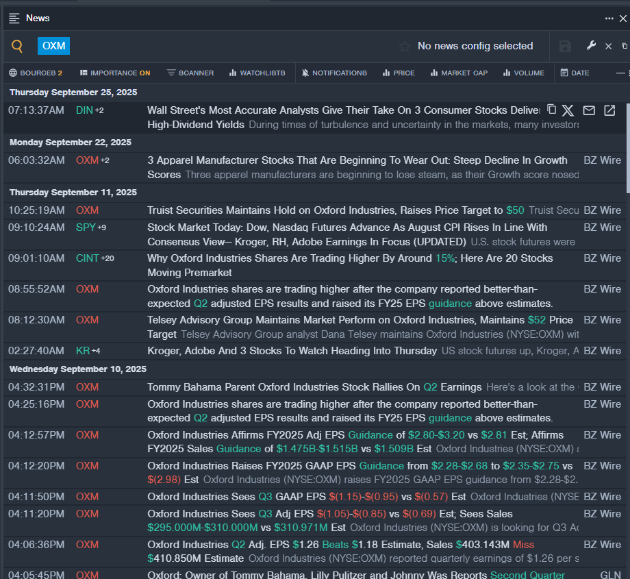 - Recent News: On Sept. 10, Oxford Industries reported better-than-expected second-quarter adjusted EPS results and raised its FY25 EPS guidance.