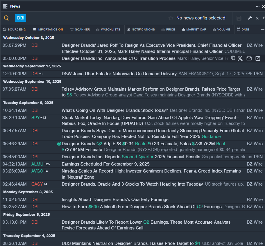 - Recent News: On Oct. 8, Designer Brands announced that Jared Poff will resign as executive vice president, chief financial officer and chief administrative officer.