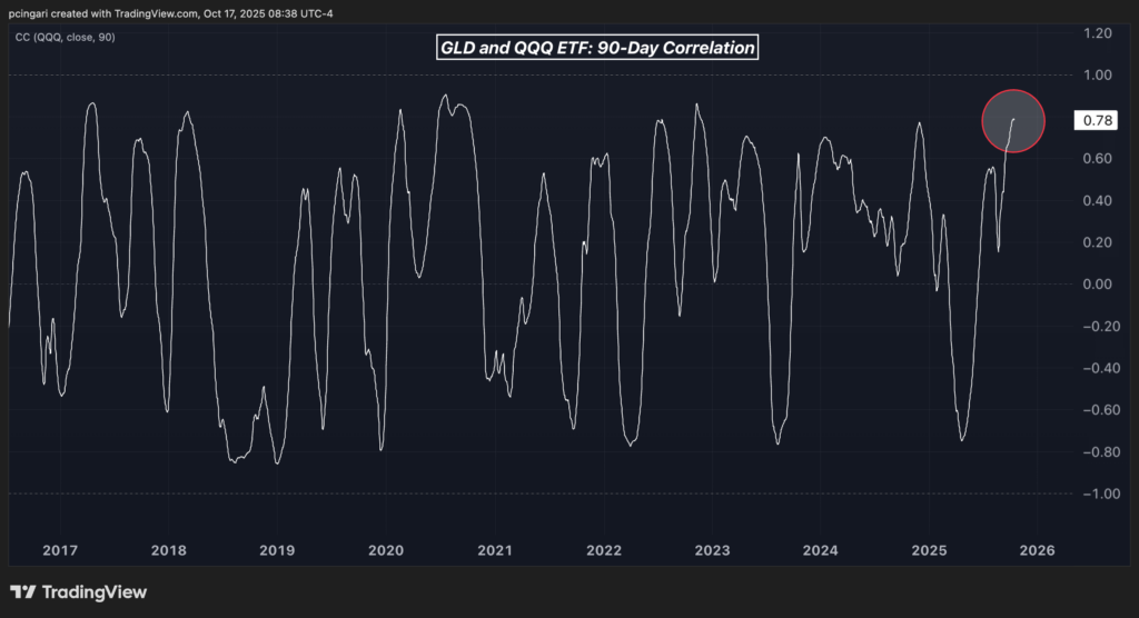 Yet, over the last 90 days, the correlation between the Nasdaq 100 – as tracked by the Invesco QQQ Trust (NASDAQ:QQQ) and gold prices – tracked by the SPDR Gold Shares (NYSE:GLD) surged to 0.78, or 78%—a level that far exceeds historical averages and the highest recorded since November 2022.
